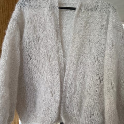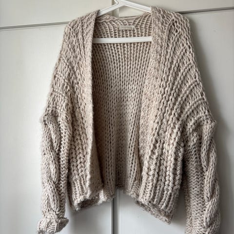 Selger en nydelig strikk i grå farge. Usikker på garntype. Store puffy armer, ingen knapper.