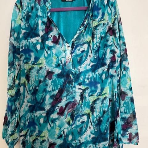 Strandkjole fra H&M i grønn og blå. Litt gjennomsiktig, og med volanger. Vide ermer nederst og en liten splitt foran på venstre side.