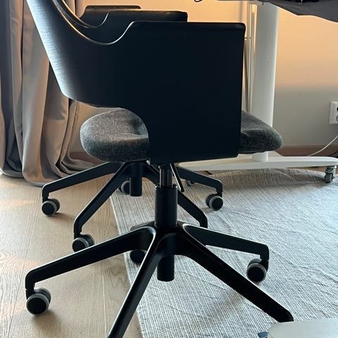 Selger en Fjällberget konferansestol fra IKEA, i svartbeiset eikefiner og mørk grå pute, uten hjul. Nypris IKEA (med hjul) 2995 kr. Noe slitasjemerker på kanten av ermene/ryggen (se bilder), derfor prisen. Er generelt lite brukt og framstår ellers i god stand.