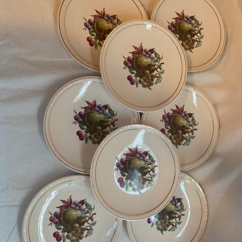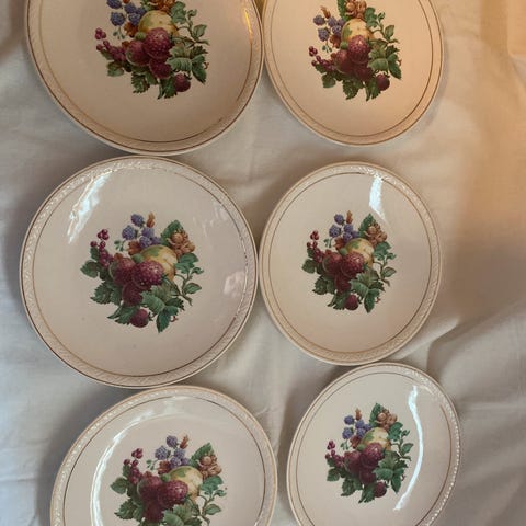 Er med fruktmotiv. Har tilhørende asjetter / tallerkner
