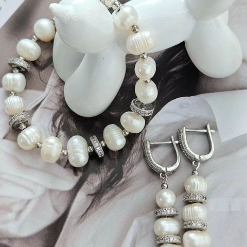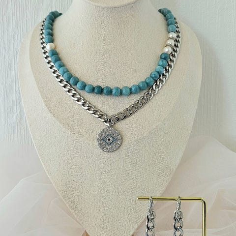 Håndlaget sett som består av halssmykke og øredobber. Smykke er 44,5+5 cm , perler er 0,6-1 cm. Hjerteanheng er 1,5×1,7 cm 🩶