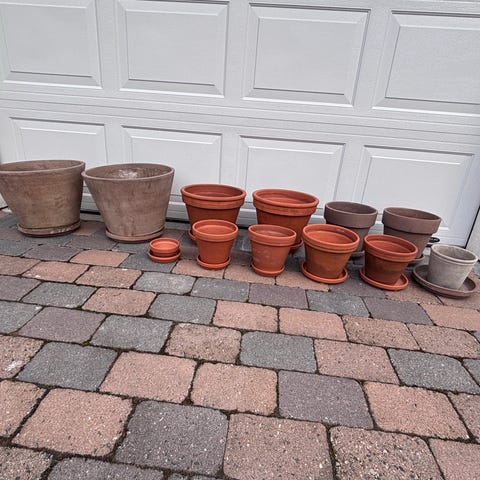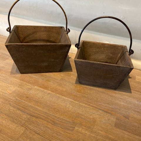 Metallbærer med terrakottapotter for hagebruk eller bruk til å så frø etc inne/ dekorasjon til julens små hyacinter etc. Bæreren er laget av metall og inkluderer 2 (løse) terrakottapotter, ideell for dekorasjon og planting av små planter. Passer til utendørs bruk. Brukt og nydelig - "lev landlig " , shappy chic 😊. Alle disse tingene man ikke har plass til når man flytter til mindre sted ... Noe må ut av huset... Terracottakrukkene 2 stk inngår. Har plass til totalt 6 slike små potter. Må hentes