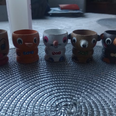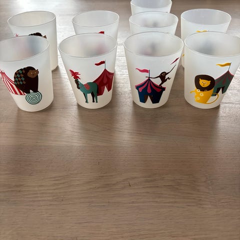 Barnekopper fra ulike danske dyreparker. De har diameter ca 6cm og høyde 7cm. Ingen skader og lite slitasje. Pris er samlet.