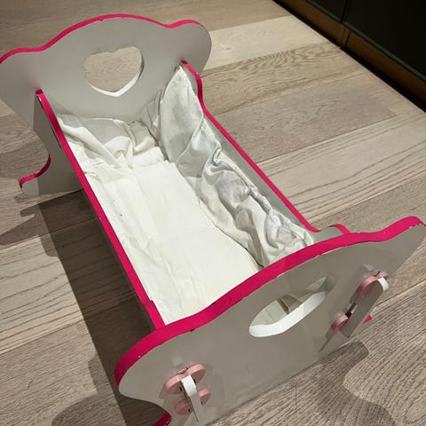 Vi rydder barnerommene! :) Dukkeutstyr selges. Inkluderer en hvit dukkeseng, rosa dukkevogn, rosa dukkestol og rosa "bilstol". Et lite merke øverst på dukkesenga. Alt pent brukt.