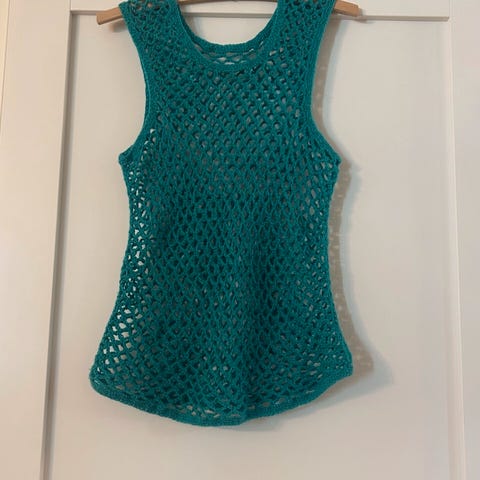 Selger en pent brukt heklet vest i sjøgrønne fargetoner. Den rekker til hoftekanten og jeg vilcsi fennpasder en størrelse S/M.