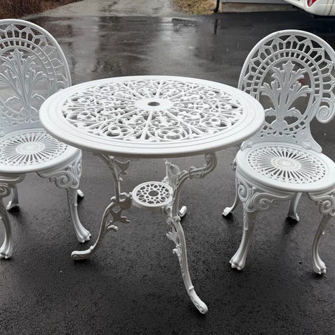Bistrosettet er laget av høykvalitets støpt aluminium, som er værbestandig og meget holdbart. Støpejernbeina legger til stabiliteten til settet. Det detaljerte blomstermønsteret vil gi enhver hage, uteplass eller vinterhage et romantisk preg.