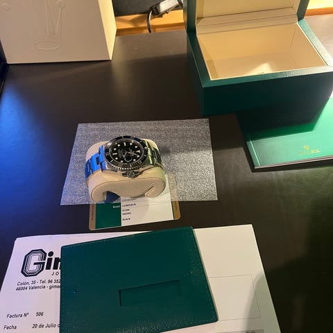 Kommer komplett med alt som fulgte med. Boks, garantikort, manual, grønn / hvit tag, bezel beskytter og kvittering fra Bjerke.