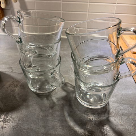 C) Håndlagde fløtemugger (3 like) Volum 160 ml, diameter 8 cm, med hank 10 cm og høyde 8 cm