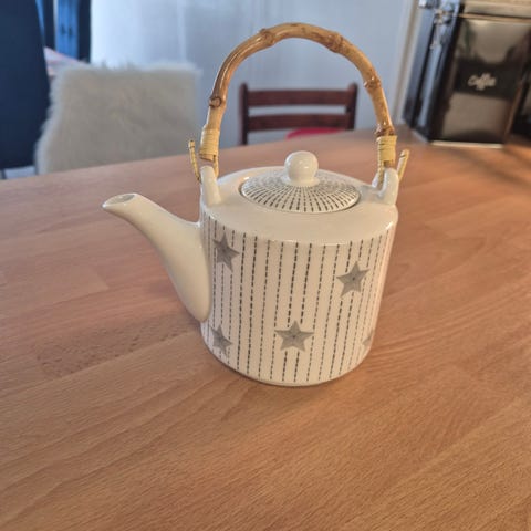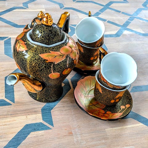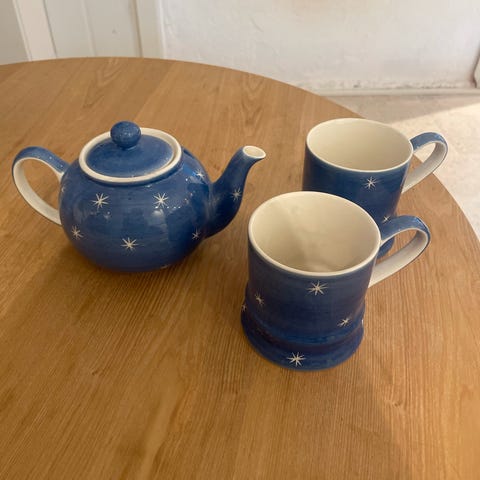 Tekanne, brett og fire kopper laget av mangotre selges. Kjøpt i Asia