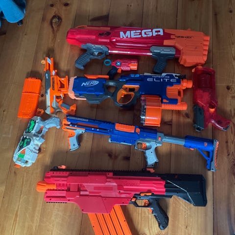 Nerf Blaster Samling består av flere blastere i ulike størrelser og design. De er laget av holdbar plast i forskjellige farger, inkludert blå, oransje og rød. Settet inkluderer både manuelle og semi-automatiske modeller, egnet for barn og ungdom som liker aktiv lek. Perfekt for utendørs aktiviteter og lekekamper. Alle er testet på guttungen med unntak av den store da den trenger batterier. Det er både ekte og uekte «kuler» mener jeg. Gutten har blitt for stor:)