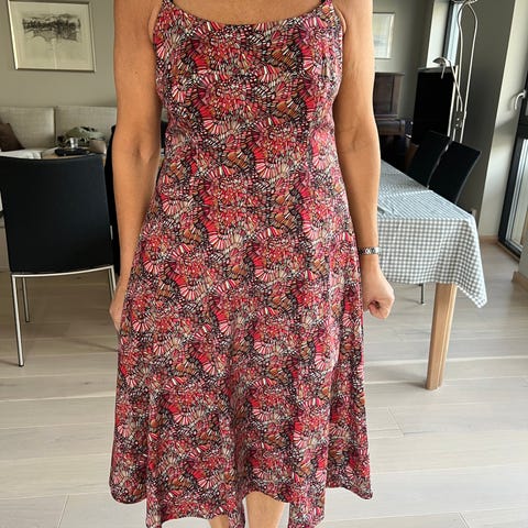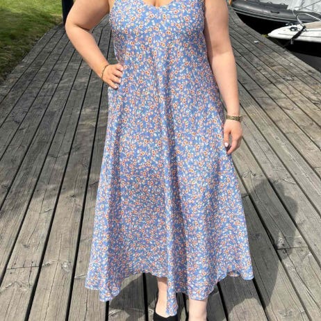 Superfin og søt kjole fra ByTimo. Nydelig blomstermønster med blå bakgrunn. Kjempefin passform også! Kan fint brukes utover høsten med strømpebukse.