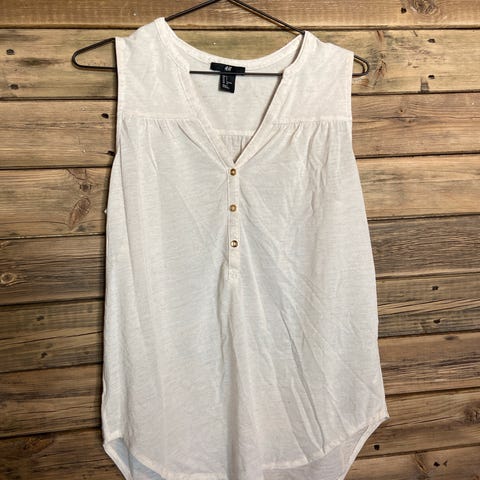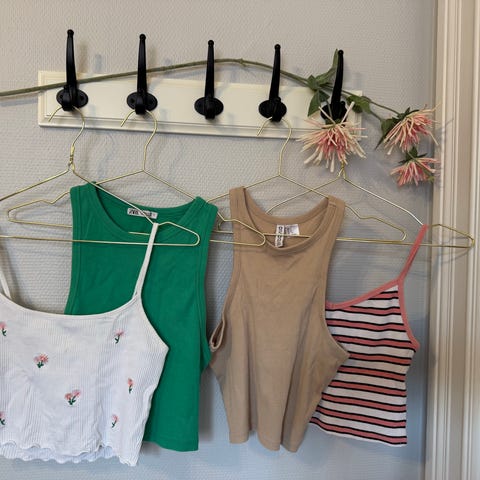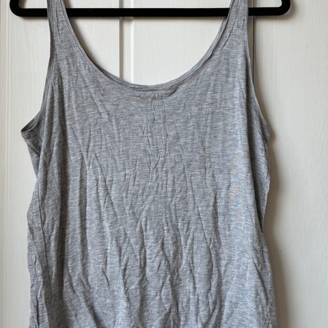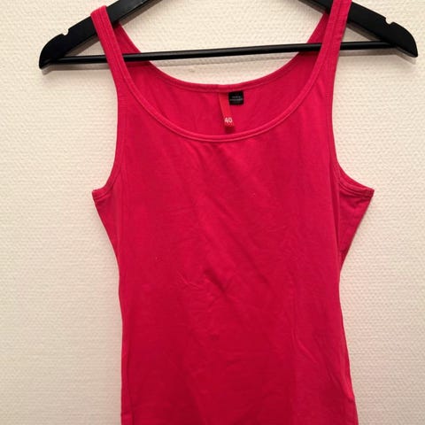 Fresh singlet / tanktopp fra H&M L.O.G.G. i str. S. Fargen er typ rød / oransje / korall og har hvit tekst som sier «La vie est faite de petits bonheurs» på fransk som betyr «livet er laget (satt sammen) av små gleder».