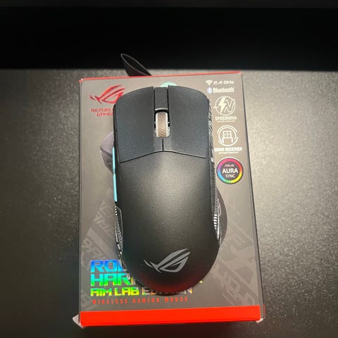 Asus ROG Harpe Ace Aim Lab Editon trådløs mus på knappe 54 gram har ROG AimPoint optisk sensor, fem programmerbare knapper med ROG Micro Switches, 3-veis tilkobling og mye mer.