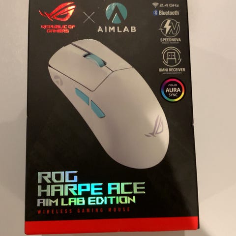 Asus ROG Harpe Ace Aim Lab Editon trådløs mus på knappe 54 gram har ROG AimPoint optisk sensor, fem programmerbare knapper med ROG Micro Switches, 3-veis tilkobling og mye mer.