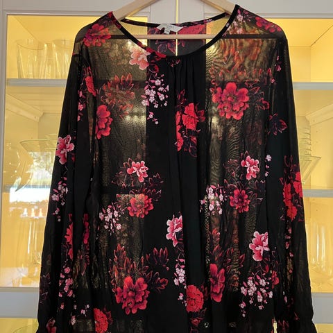 Lekker bluse i flotte farger, med v-utringing og litt sånn puffermer. Lite og pent brukt.