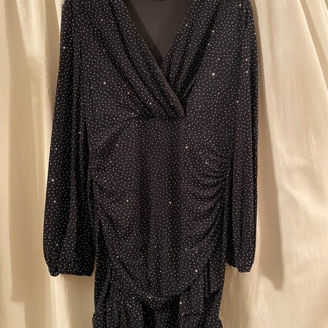 Kjole som er dekorert med paljetter i sølv. Den har rund hals og lange smale ermer. Noe åpen rygg med knyting bak i nakken. Matchende fòr i mykt materiale som føles behagelig mot huden.