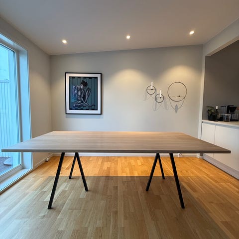 Selger samlet fint brukt eikebord med lengde 240 cm med 2 x 0,5 M ileggsplater, 8 stk Hay stoler, samt 2 stk Hay barstoler. Alt kjøpt nytt hos Ølen Møbel. Må hentes.