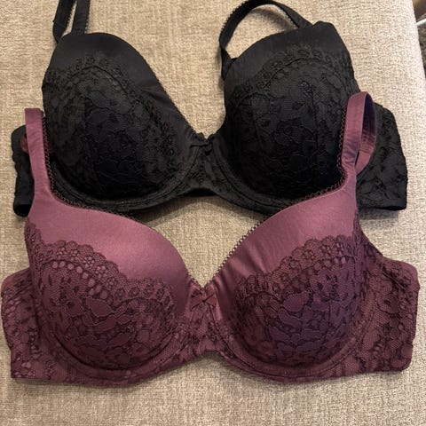 To bh’er fra Victoria’s secret, størrelse 36D som skal tilsvare 80D. Den sorte har litt bruksmerker i form av nupper på innsiden. Den lilla ser er lite brukt og ser helt ny ut.