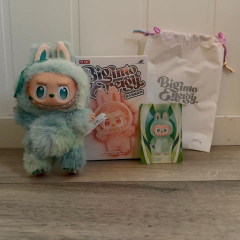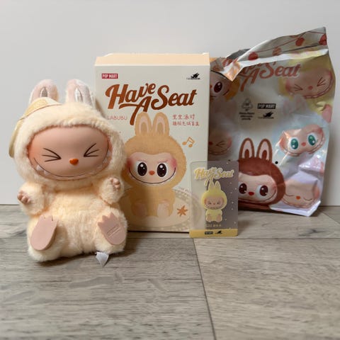 Selger en Labubu ZIZI - The Monsters Have a Seat Vinyl Plush fra Pop Mart. Boksen er åpnet kun for å sjekke fargen, men selve Labubuen er helt ny og fortsatt forseglet i originalposen.