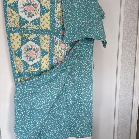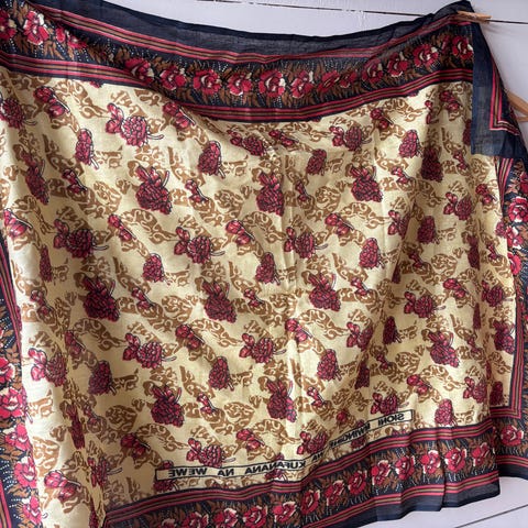 Frisk flerfarget duk i grønt, blått, gult/oker og hvitt. Sannsynligvis batikk eller trykk (?) med motiv av hvite blomster-firkanter som repeteres mot bakgrunnen i hovedsakelig grønt, blått og gult/oker. Lengde på ca 355 cm, mens bredden er på ca 90 cm dvs. svært lang og vil være perfekt til et vårlig langbord eller til sommerfest i bakgården! Sannsynligvis ren bomull. Jarekanter i sidene, og lagt opp for hånd i begge ender. Duken er omtrent 15-20 år gammel, men kun brukt en gang eller to og er følgelig i god stand med liten/ingen bruksslitasje. Duken er en gave og muligens kjøpt i Østen. Kan også brukes som gardin.