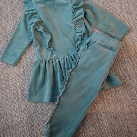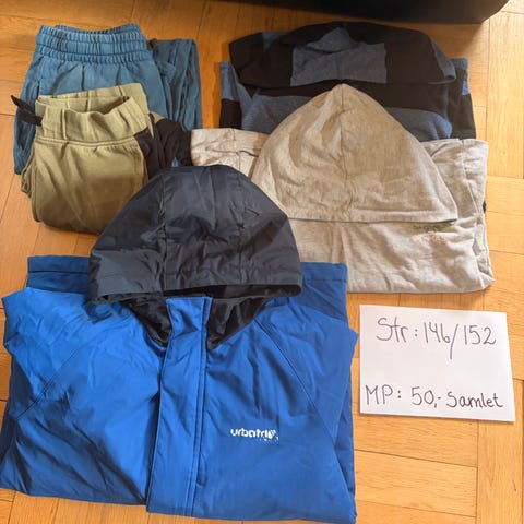 Merkene er stort sett Name it og cubus. Størrelse 92, bortsett fra én av buksene (86), men den kan kneppe opp i beina til shorts. Et sett badetøy samt en genser for den ulveinteresserte.