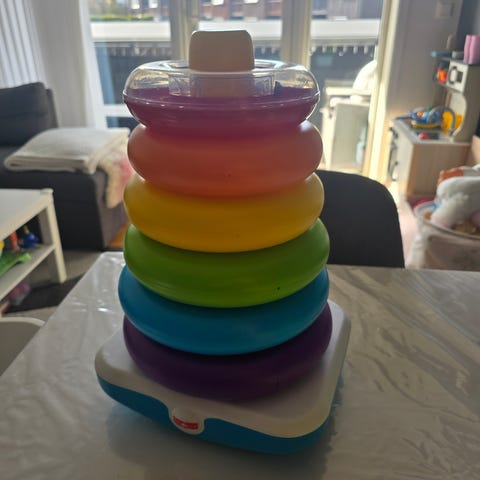 Fargerikt stabletårn med seks ringer i ulike størrelser og farger. Perfekt for å trene motorikk og størrelsesforståelse.