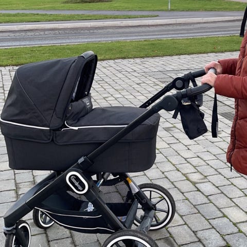 Det følger også med myggnetting, solbeskyttelse SPF 50, en stelleveske av merket Emmaljunga som kan henges på håndtaket, og et trekk til bagdelen.