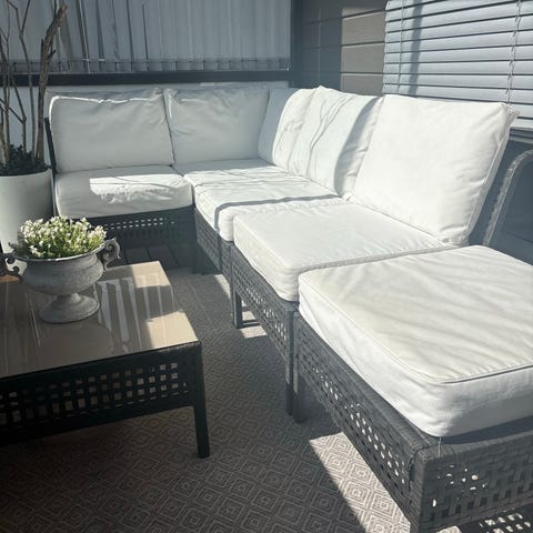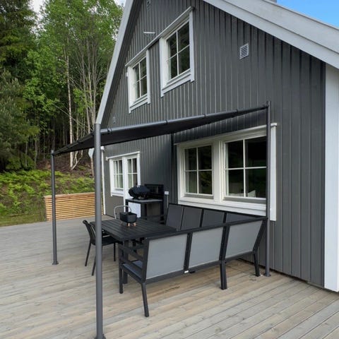 Sofaens moderne design med svarte rammer og lyse puter passer perfekt inn i skandinaviske uterom. Den står flott under en pergola eller rett på terrassen – og det medfølgende lave salongbordet gir det lille ekstra til loungestemningen.