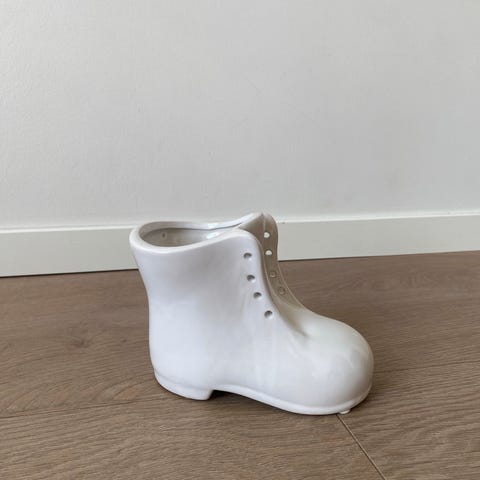 Flott sko til å ha blomster i ute eller inne. Den er tung og støpt i betong.