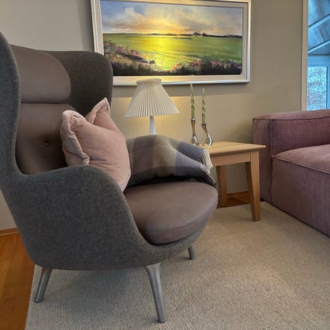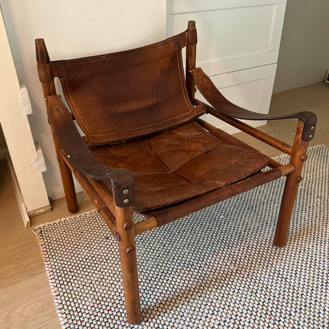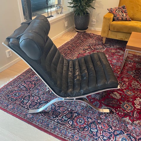 Selger en original Arne Norell Ari lenestol med pall i klassisk design fra 1966. Dette er en ettertraktet svensk designklassiker, kjent for sitt tidløse formspråk, førsteklasses materialvalg og høye komfort. Settet består av en lenestol og tilhørende pall i samme utførelse.