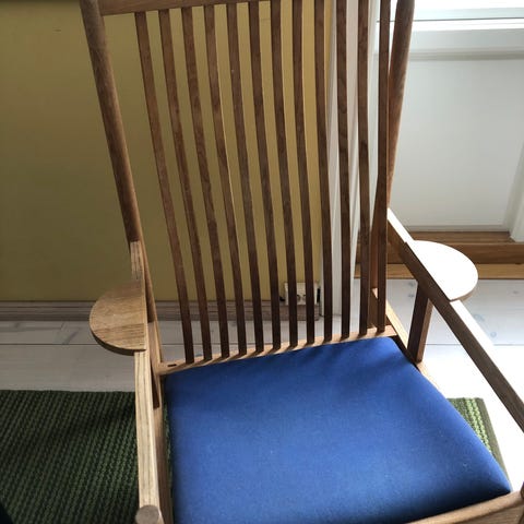 Min er i røkt eik (25% dyrere enn lys eik) og med sittepute i semsket skinn.