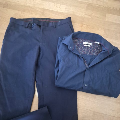Selger klassiske bukser og en skjorte. Bukser i størrelse W30, L32 og skjorte i størrelse M. Varene er i veldig god stand, brukt én gang.