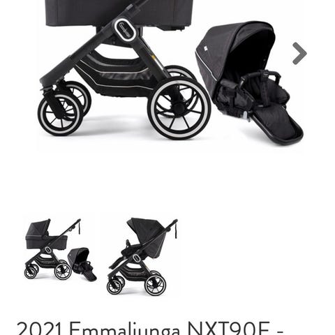 Det kan følge med original myggnetting med solskjerm som festes på vognen, koppholder, fotpose til sittedel, adapter til bilstol og originalt ståbrett/søskenbrett.