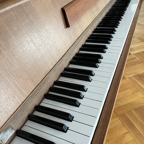 piano, hadde noen kosmetiske feil, som du kan se på bildene. Ellers fungerer den som den skal. (Needs to be tuned)!
