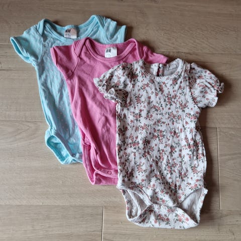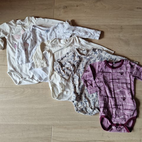 En liten klespakke av kortermet bodyer i st. 68. En av bodyene mangler en knapp (se bilder).