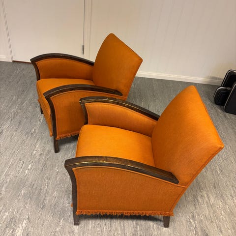 Stolen til venstre trenger litt kjærlighet, stolen til høyre er meget bra for alderen. Stolene selges samlet.