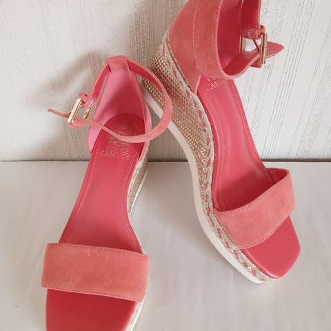Vince Camuto sandaler med strassdekorasjon for damer. Størrelse 38. Sandalene har en brun såle og er utsmykket med glitrende detaljer som gir et elegant preg. Passer godt til sommerlige antrekk og spesielle anledninger.