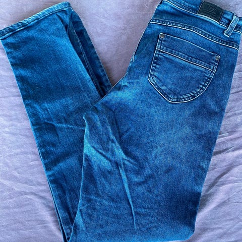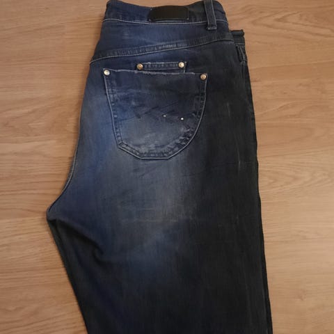Lite brukt i bra stand. "Jeans by Bessie", Italia. Høyt liv. 2 lommer foran + 2 lommer bak. 64% bomull + polyester/elastan. Livvidde 76 cm, lengde 98 cm. Bildefarger er litt feil pga lyset.