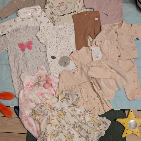 Klespakke med mange fine sommerklær til jentebaby! Flere av plaggene er ubrukte. Klespakken inneholder: