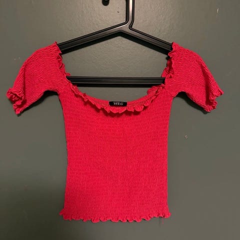 Kortermet topp med kort midje fra H&M i str. M. Vaffelsøm. Ermene kan dras nedom skuldrene for off-shoulder look. Lite brukt.