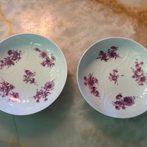 Sett med 4 kopper og skåler. Håndmalt gulldekor. Oppbevares i praktisk polstret etui. Settet er som nytt, kun brukt en gang. Selges for kr 290,00