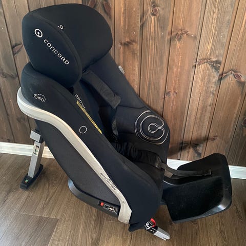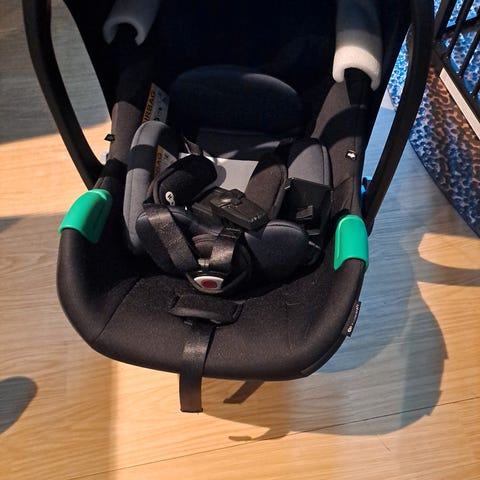 Selger bilstol med tilhørende tralle og stelleveske av merket Kinderkraft.