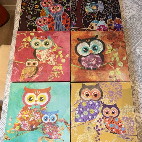 Fargerike og søte bilder på lerret med uglemotiv. 40x40 cm. Har hengt på veggen og ser helt fine ut. Et hjørne på det ene er litt slitt, men vises ikke når bildet henger på veggen. Hentes på Geilo. Kan sendes fiks ferdig. Kan leveres fraktfritt til Kongsberg eller Harestua i løpet av sommeren.