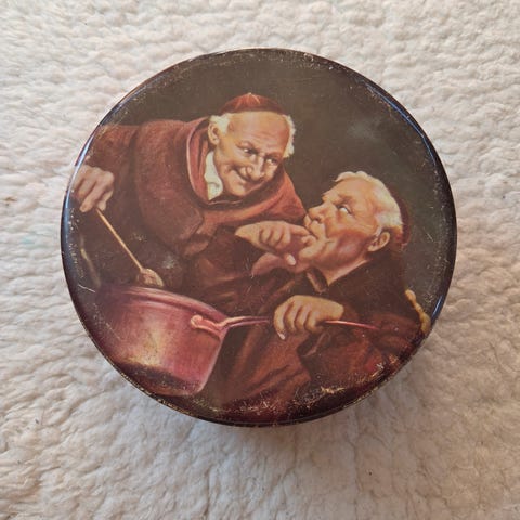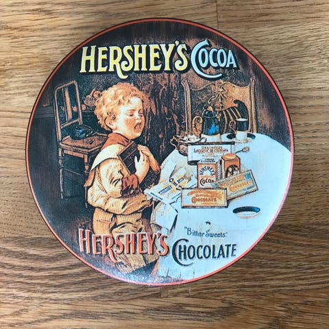 Original Reese's metall boks. Diameter ca 17 cm med lokk, ca 16,5 uten lokk, nederst 14,5 cm,