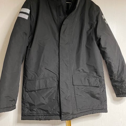 Pent brukt foret parkas i str L. Farge:sort. Har to små klisterflekker som ikke gikk bort i vask. Nyvasket og klar for å holde en ny russ varm i noen dager.