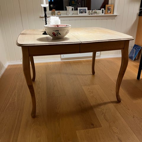 Spisebord i heltre eik robust hvitoljet eik det er 2 ileggsplater H 75 B 90 L 180 - 270 selges 13 000