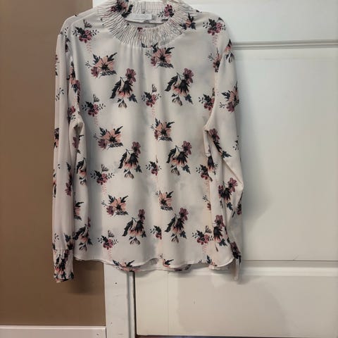 Floyd kira pandora - Str L. Denne skjorten har dyp v-hals med skjortekrage. Knapper nedover hele front. Lange ermer med legg på skuldrene og 3 knapper nederst på mansjettene.