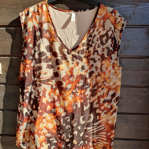 Selger helt ny blusetopp med korte armer fra Signature. Str XXL. Dyrisk print forann på sort glatt stoff. 94% viscose og 6% spandex.