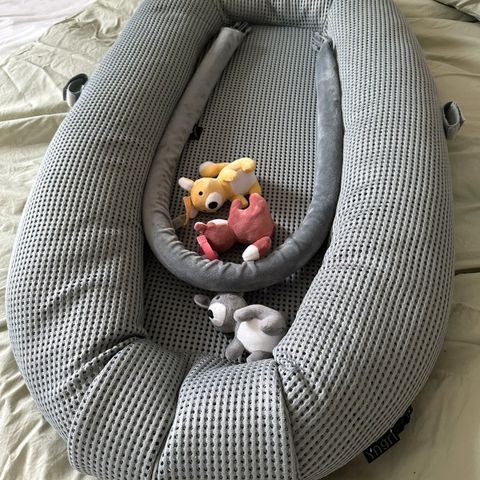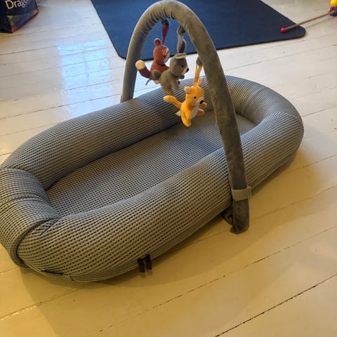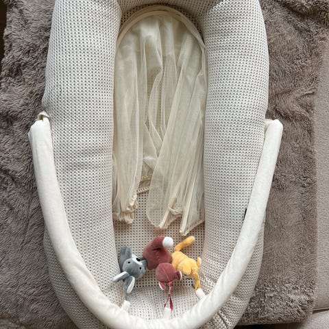 Praktisk babynest med avtagbar lekebøyle. Kan også forlenges i fotenden. Pent brukt av én baby. Nypris 800 kr - selges nå for 300 kr.
