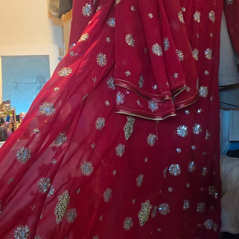 Selger en vakker rød anarkali-kjole med detaljerte gullbroderier. Kjolen er brukt kun én gang og fremstår som ny.